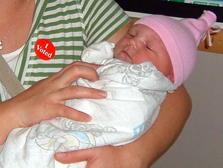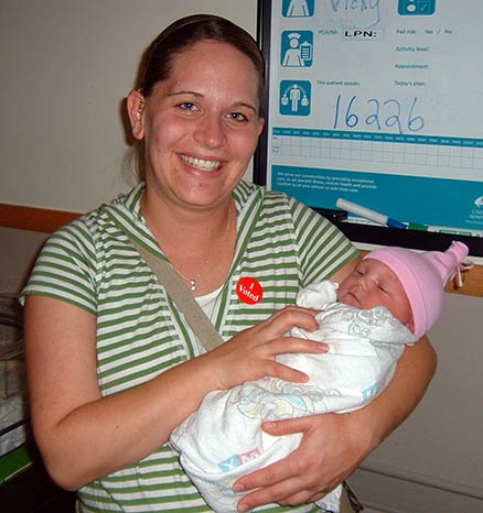 Nat and Sarah had their baby today. Sarah gave birth to Alexis Grace Burlingame. She came into this world at 8 lbs. 11 oz., and 21 inches long. Alexis has some peach-fuzzy hair. She’s a very cute baby and has been very quiet thus far. Nat said when he was in the nursery, many of the other babies were wailing away, but she just sat content. Here is Megan holding Alexis, with a closeup of the new baby.