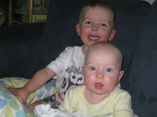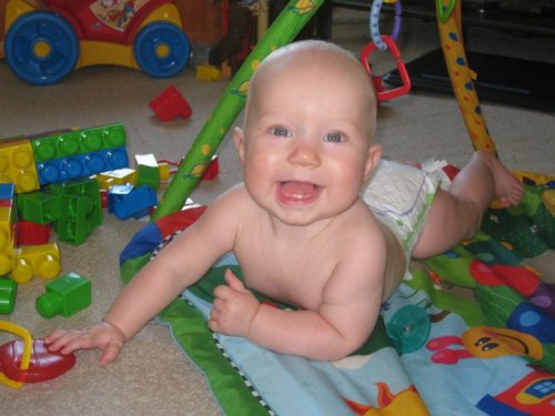 Noah is busy growing and becoming a porker!! He is now a master at rolling around on the floor. He’s getting better at learning to sit up. He loves to play with his toys. Noah has discovered his voice and babbles a mile-a-minute just like his brother. They can be found having ‘conversations’ together, lots of giggling! Noah is learning to crawl, he’s not quite there but he can army crawl and scooch around on the floor. Lynn, our daycare provider, said he is a man with a mission at her house (he chases the dog). :) Noah is also becoming quite the eater, he will eat just about anything put in front of him without much fuss. He recently started eating broken down goldfish and loves them.