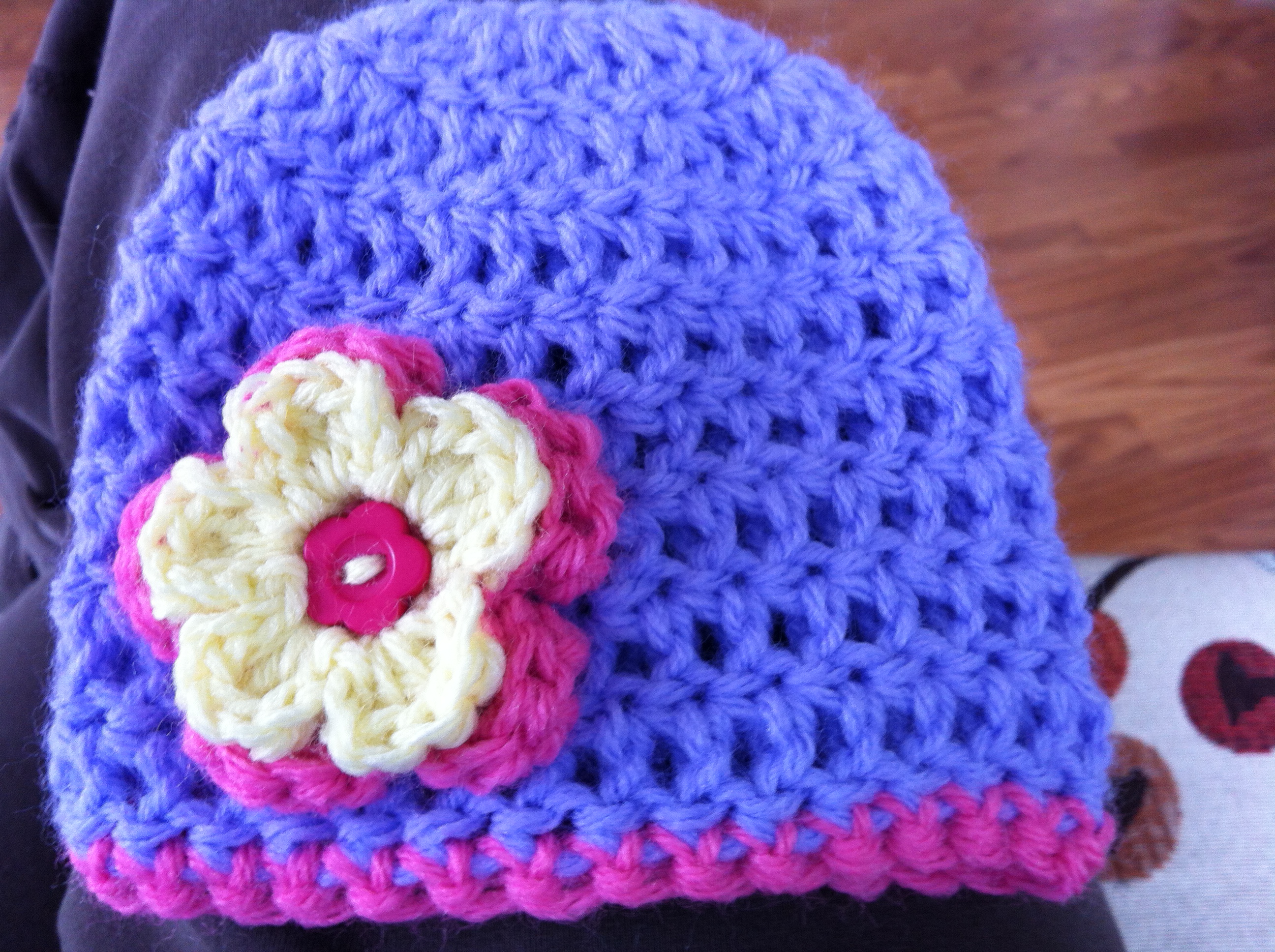 Katie and I both crochet. Grandma Babcock taught her and Mom taught me. We shared some giggles on our learning experiences. Mom is a lefty and taught me how to crochet left-handed, I’m a righty. It took some time but I managed to switch over to right-handed crocheting. I couldn’t tell you or show you how to crochet as lefty any more, too many years have passed. Anyway, we went shopping for yarn (I didn’t buy any, even though I wanted to). Katie cleared out some clearance yarn to practice making baby blankets to give away. I finished a baby blanket for a sweet baby girl (I’ll post pictures soon). Like old women, we sat in the sun room and crocheted, chatted and drank tea. It was such a blessed time. Here’s a picture of a hat I crocheted for the sweet baby girl (mentioned above).