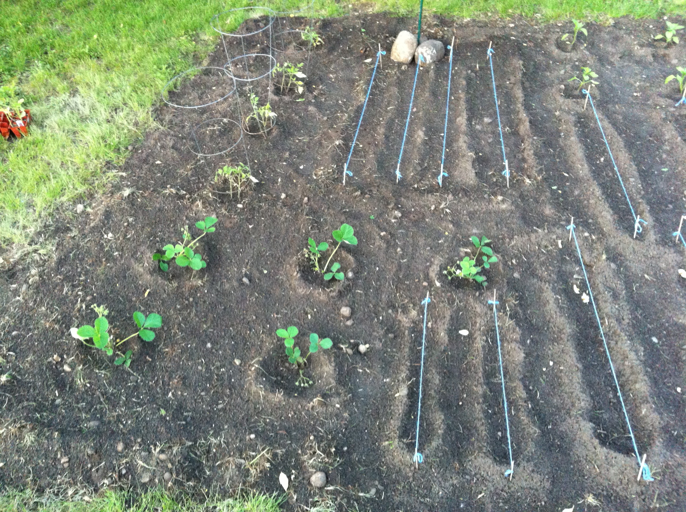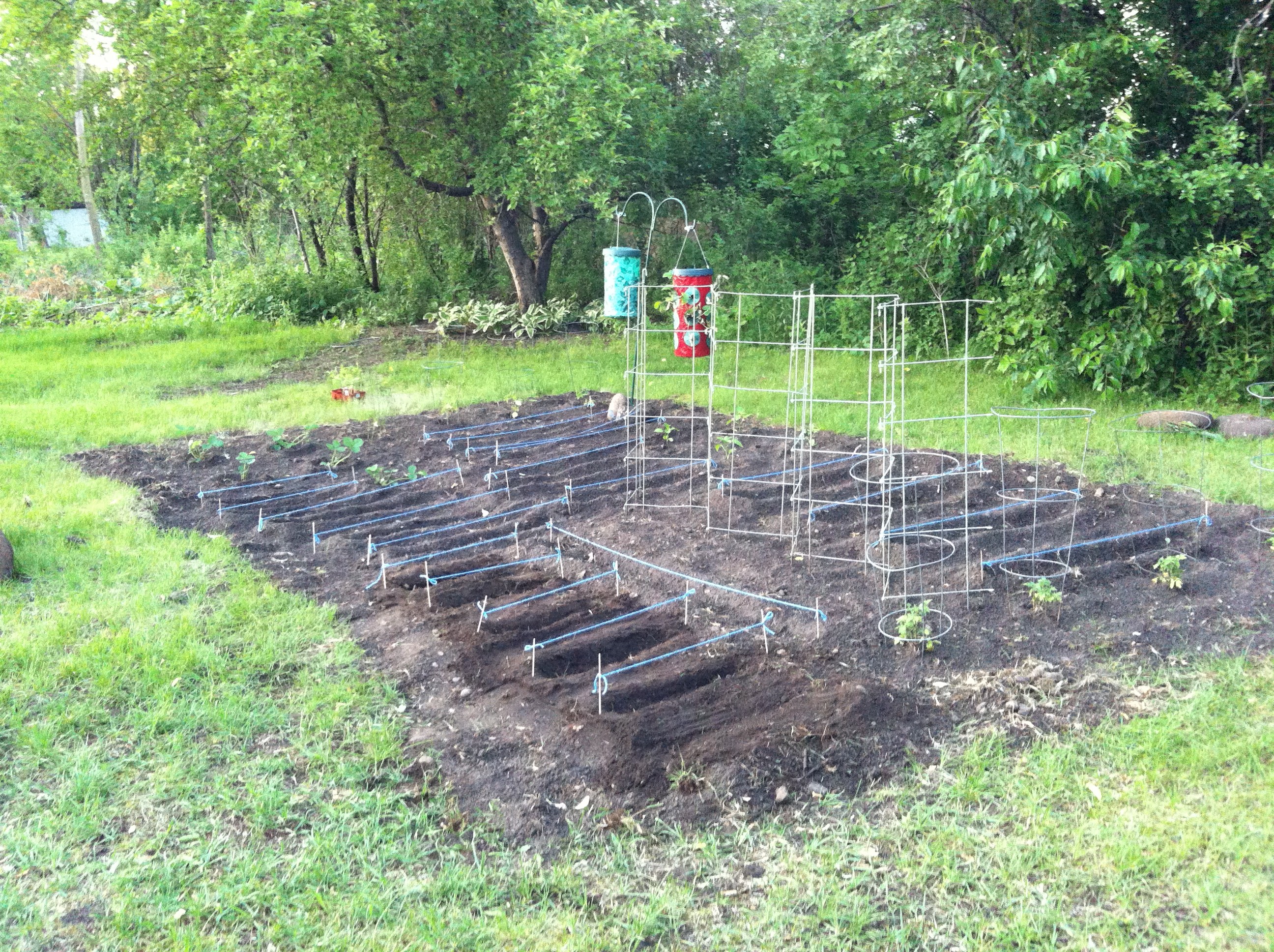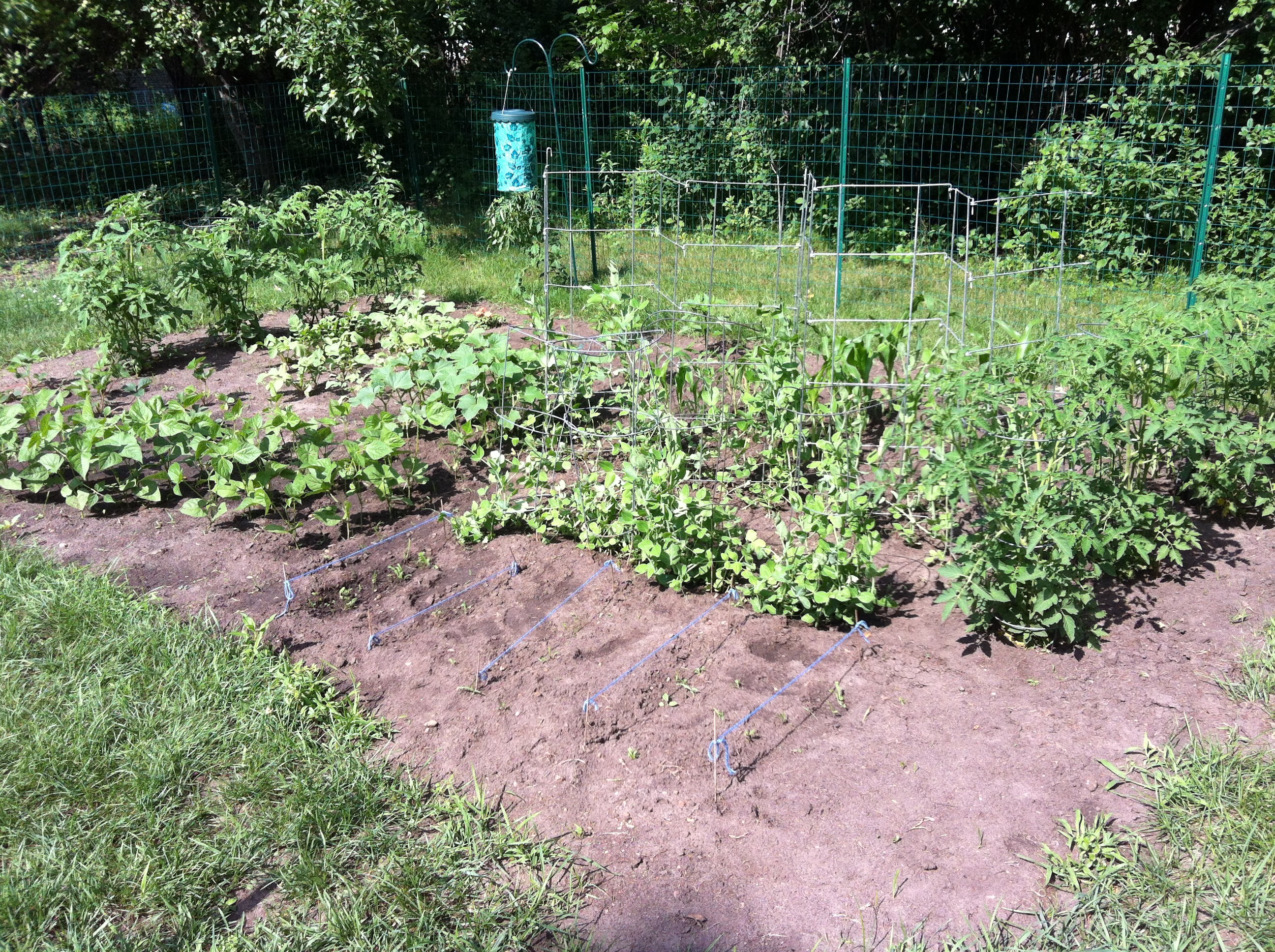 Here is the finished product of the planting. I used sticks and string to identify where the rows are, I wanted to make sure I wasn’t pulling up plants while thinking they were weeds. It helped, a lot!! The zigzag wire thingy is for the peas to grow up.